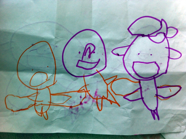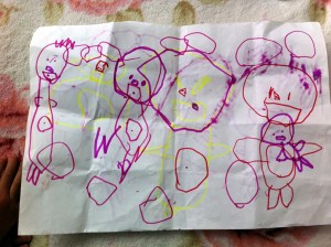 牛牛最近创作欲旺盛,第一幅画就是传说中的Happy House,这是一幅杰作,至于爸爸为什么站在外边,原先以为是House里挤不下去了,后来经作者解释了才知道,