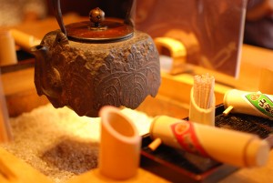 中午吃饭,日本朋友带我们来到一家荞麦面馆,同样外表毫不起眼,在京都的老巷子里,这样的门面几乎随处可见,里面却是别有洞天,不仅有楼上楼下,而且所用餐具尽显自然,还有这老铸铁茶壶,它的重量就代表它的经历。